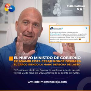#Ecuador | El presidente electo Guillermo Lasso oficializó a Cesar Monge como su Ministro de Gobierno. El Ministerio de Gobierno...