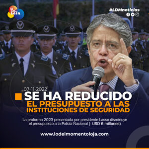 En la proforma 2023 presentada por el presidente Lasso disminuye el presupuesto para la Policía Nacional (USD 6 millones), el...