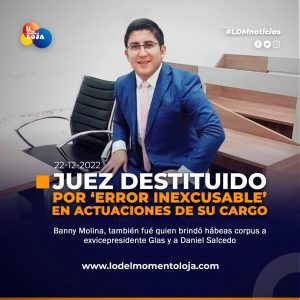El Pleno del Consejo de la Judicatura (CJ) destituyó este jueves, 22 de diciembre de 2022, al juez de Portoviejo Banny...