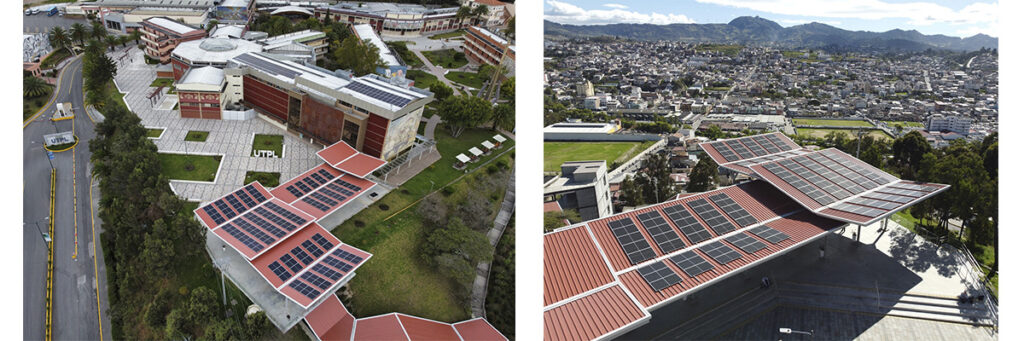 La Universidad Técnica Particular de Loja (UTPL), cuenta con 300 paneles solares y 130kWp de potencia instalada que producen energía limpia y renovable para abastecer el consumo interno de una parte de sus instalaciones pero, también contribuye al abastecimiento eléctrico de la red nacional con la transferencia del excedente generado por este sistema alternativo de energía, el cual fue instalado en coordinación con la empresa Ingeniería Verde que es liderada por David Aguirre Burneo, UTPL ALUMNI de la carrera de Electrónica y Telecomunicaciones.
