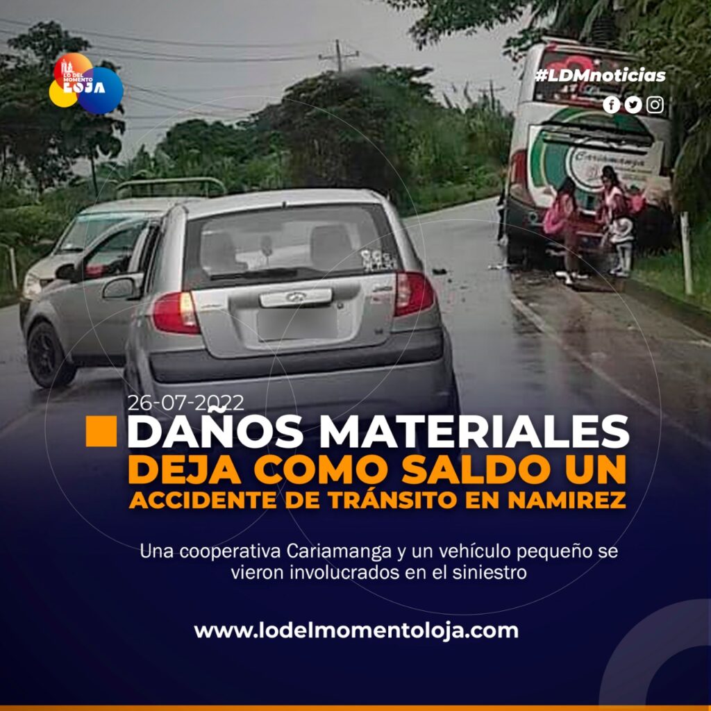 #Loja | Un accidente de tránsito se registró en el sector Namirez, en donde se ven involucrados una unidad de la cooperativa cariamanga y un vehículo pequeño, se registró varios daños materiales. No se registran heridos de gravedad.