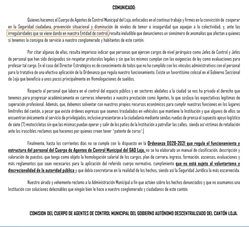La Comisión del Cuerpo de Agentes de Control Municipal del Municipio de Loja, mediante una carta pública que habrían varias irregularidades en la institución de control, que ejercen cargos de nivel jerárquico como Jefes de Control y Jefes de personal que han sido designados sin respetar protocolos legales y sin que los mismos cumplan con las exigencias de ley como evaluaciones para profesar tal cargo, privación al derecho de progresar académicamente en carreras inherentes y hasta el punto de solventar con sus propios recursos económicos para cumplir nuestras funciones en los lugares limítrofes del cantón.
