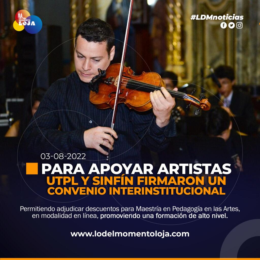 La Universidad Técnica Particular de Loja (UTPL) y el Sistema Integrado Filarmónico Infanto-Juvenil (SINFÍN), suscribieron el 01 de agosto de 2022 un convenio que permitirá adjudicar descuentos para la Maestría en Pedagogía en las Artes, en modalidad en línea, promoviendo una formación de alto nivel, capacitación y perfeccionamiento profesional. Para obtener el beneficio, los aspirantes deberán presentar la documentación que justifique su vinculación con la institución favorecida.