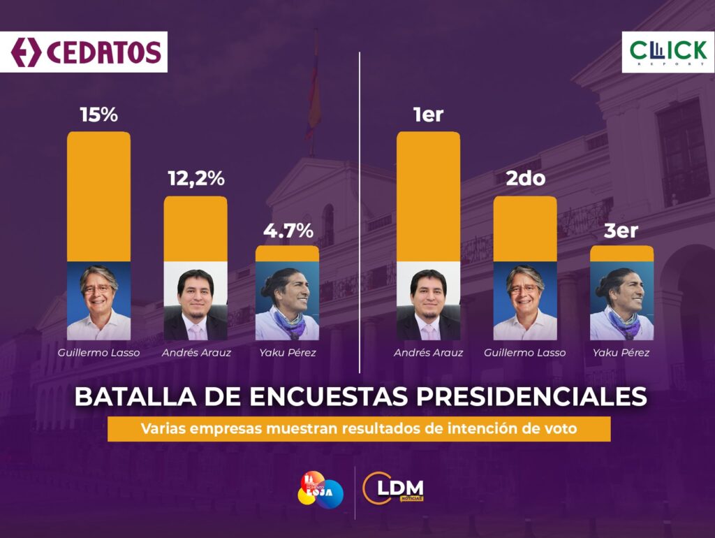 En los últimos días, varias encuestadoras han expuesto el resultado de sus sondeos electorales para la Presidencia de la República del Ecuador, tal es el caso de Click Report y Cedatos, quienes dejan en porcentajes diferentes y sin coincidir la intención de voto.