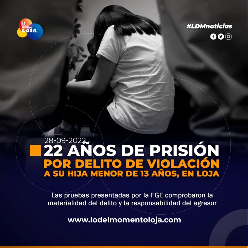 #Loja |Un Tribunal de Garantías Penales de Loja dictó sentencia de veintidós años de pena privativa de libertad en contra de un hombre que violó a su hija. Las pruebas presentadas por la Fiscalía General del Estado comprobaron la materialidad del delito y la responsabilidad del agresor.