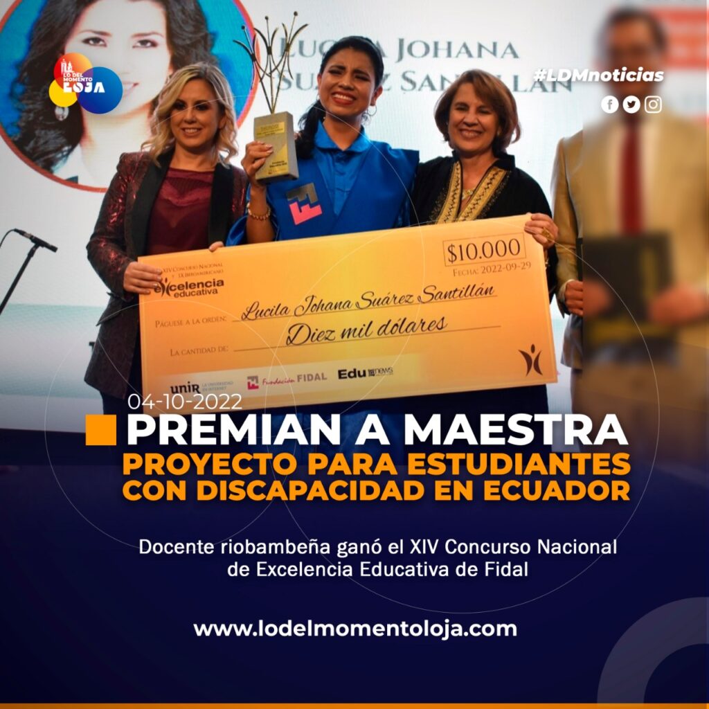 La riobambeña Lucila Johanna Suárez Santillán es la ganadora del XIV Concurso Nacional y IX Iberoamericano de Excelencia Educativa de FIDAL, por poner en marcha el proyecto enfocado en la inclusión de estudiantes con discapacidad, en la Unidad Educativa Especializada Dr. Luis Benavides Benavides, de la provincia de Chimborazo.