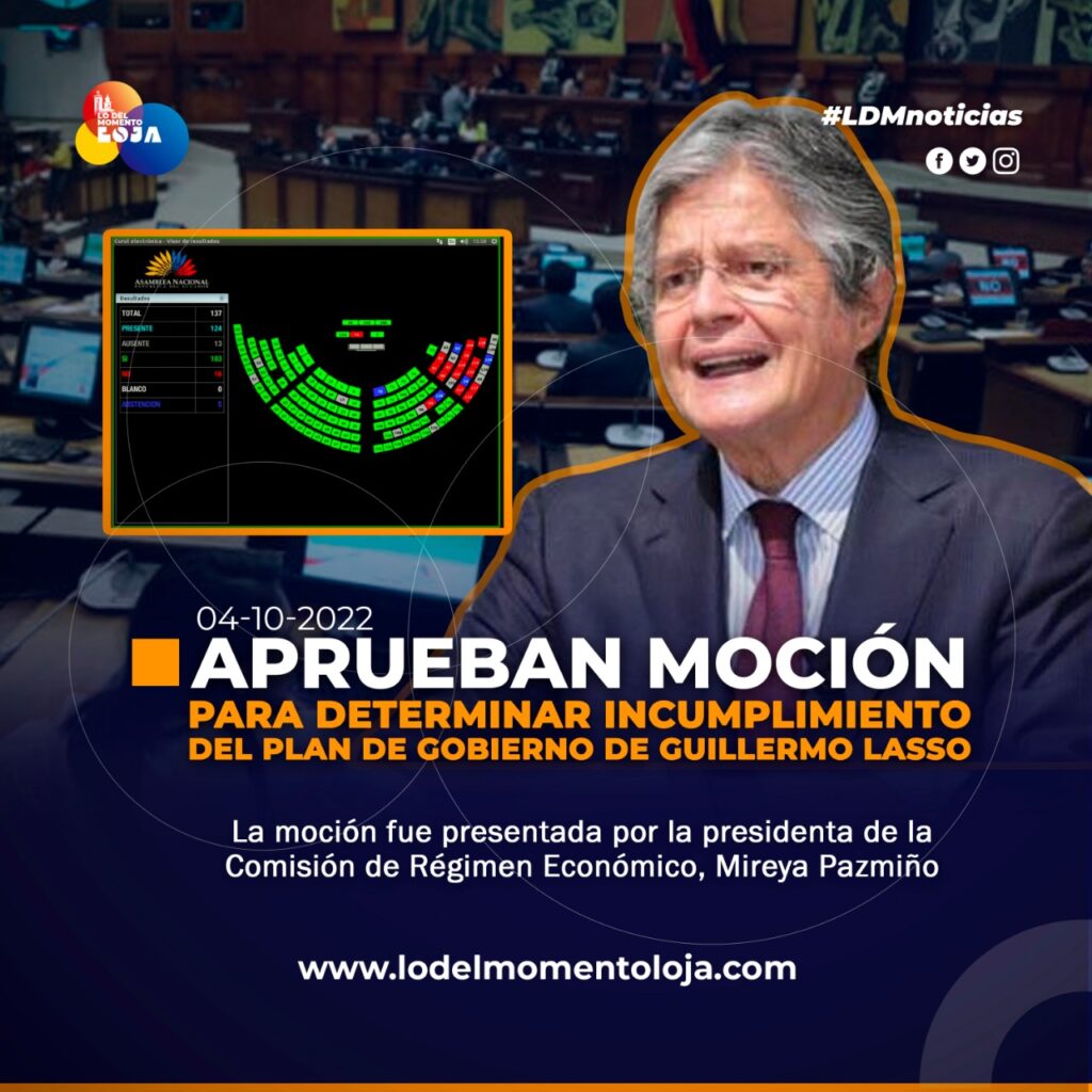 Este 04 de Octubre, el Pleno de la Asamblea, aprobó con 103 votos a favor, 16 en contra y 5 abstenciones, de 124 legisladores presentes, una resolución donde se determina el incumplimiento del Plan de Gobierno de Guillermo Lasso.