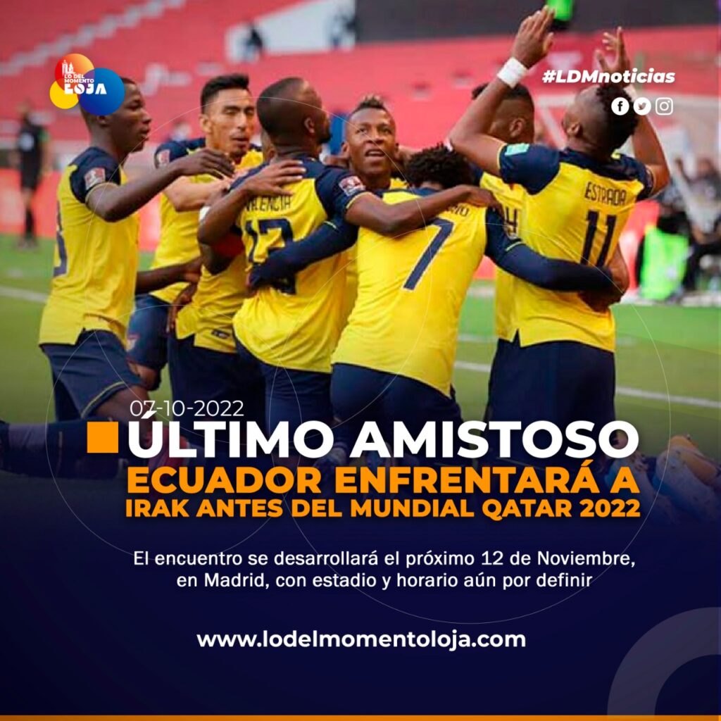 El encuentro se desarrollará el 12 de noviembre, en Madrid, con estadio y horario aún por definir. Ecuador tendrá su último partido comprobatorio, apenas ocho días antes del debut en el Mundial de Qatar. El jueves 6 de octubre, la Federación de Fútbol de Irak confirmó el amistoso a la Tricolor en su cuenta de Twitter.