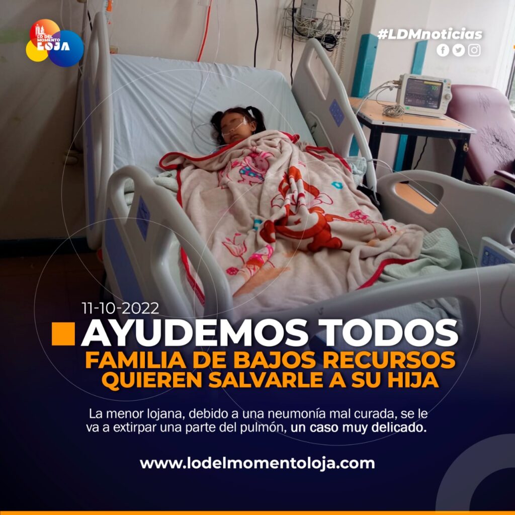 [COMPARTIR] | La infante lojana de dos años y 9 meses de edad, de nombres Gladys Q, ha sufrido un quebranto en su salud debido a un derrame pleural + neumonía, esto afectado directamente a uno de sus pulmones hasta el punto de extirpar parte de su órgano respiratorio, por lo que sus familiares de bajos recursos económicos, imploran a la ciudanía apoyar con su grano de arena. La menor se encuentra ingresada a un centro de salud.