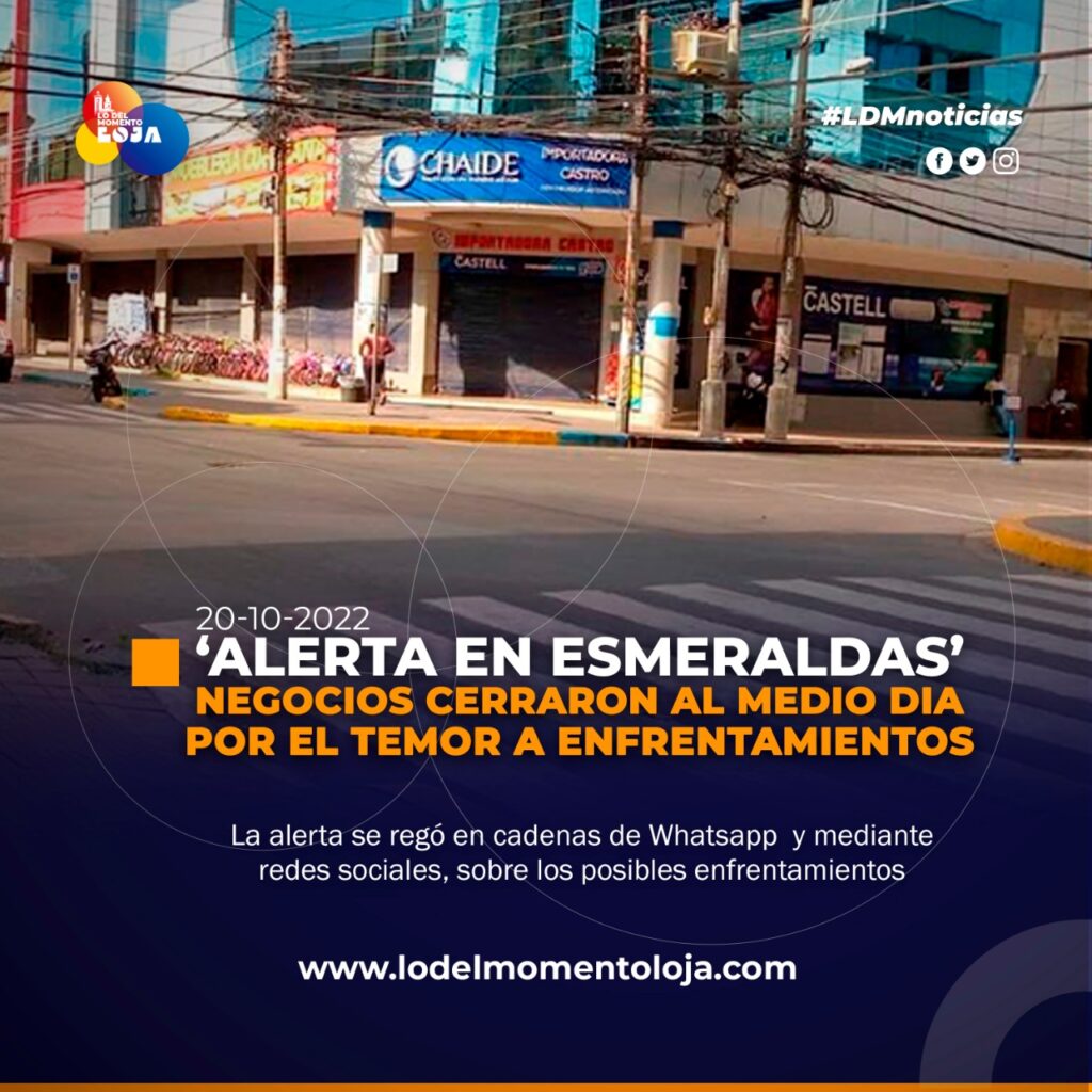 #Nacional | Una alerta que se regó en cadenas de WhatsApp y redes sociales sobre un posible enfrentamiento de bandas en Esmeraldas provocó que negocios e instituciones cerraran al medio día del miércoles 19 de octubre del 2022.