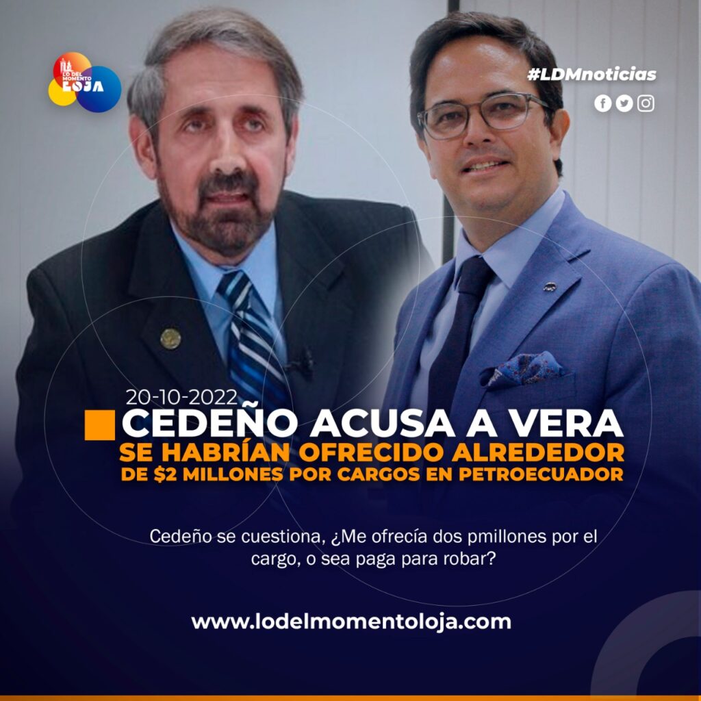 #Loja | El medio de comunicación “La posta” revela un audio de Ítalo Cedeño, exgerente de Petroecuador, donde acusa al actual ministro de Energía, Xavier Vera, que le ofreció $2 millones por cargos en Petroecuador. Cedeño se cuestiona, ¿Me ofrecía dos millones por el cargo, o sea paga para robar? ¿Cuánto querrá robar si paga 2 millones para entrar?.