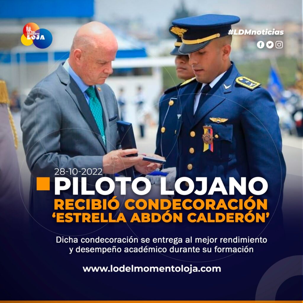 El lojano José Iván Buenaño Cueva, recibió la Condecoración “Abdón Calderón”, por haber obtenido la Primera Antigüedad de la Septuagésima Segunda Promoción de Oficiales de Arma de la Escuela Superior Militar de Aviación ‘Cosme Rennella Barbatto’, condecoración que se entrega al mejor rendimiento y desempeño académico durante su formación y que fue impuesta durante esta ceremonia por el vicepresidente de la República, Alfredo Borrero.