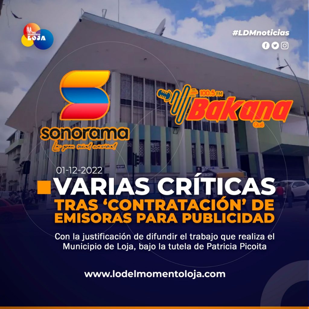 #Loja | Se conoce que Radio Sonorama, fue contratada por la municipalidad bajo los “servicios de publicidad para difundir el accionar el municipio de Loja, por un monto de 4000 dólares. Y Radio Bakana, se le asignó, un contrato de publicidad por 2,000 dólares, esto con la justificación de difundir el trabajo que realiza el municipio de Loja, en la administración de Patricia Picoita.