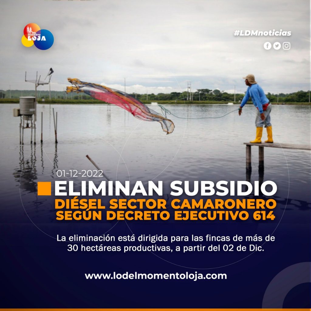 Mediante Decreto Ejecutivo 614 se dispone que a partir del viernes 2 de diciembre se elimine el subsidio al diésel del sector camaronero para fincas de más de 30 hectáreas productivas.