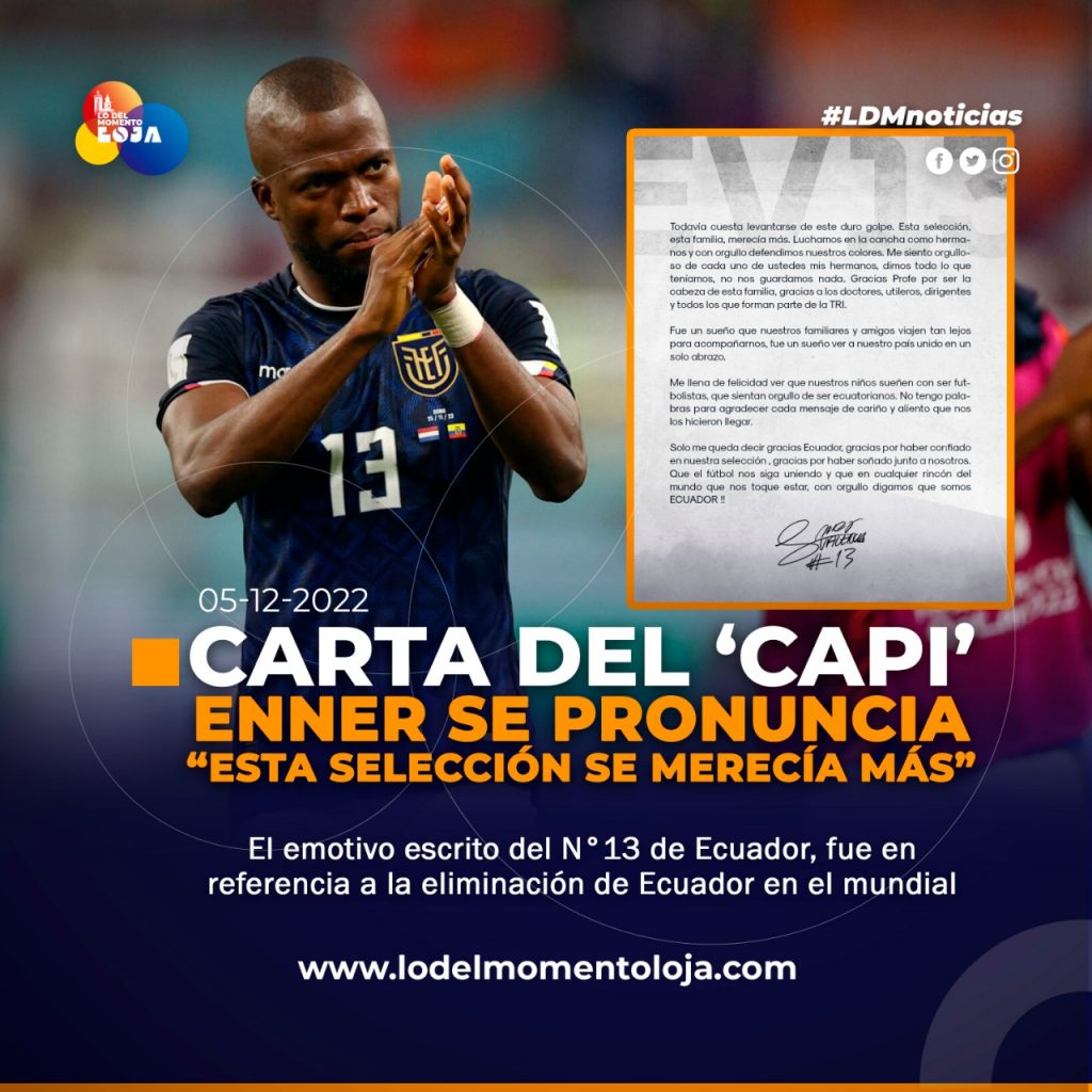 La carta, compartida a través de sus redes sociales este lunes, 5 de diciembre de 2022, refleja el sentir de Valencia, quien se sincera sobre el esfuerzo realizado en la cancha y expresa gratitud con los ecuatorianos por el apoyo brindado.