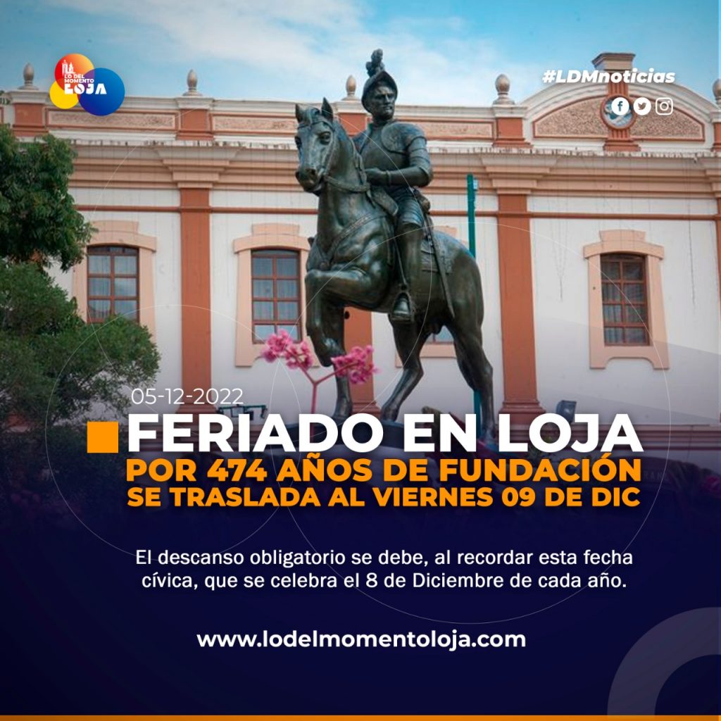 😎🎉🎊 ¡Feriado obligatorio! Tras conmemorarse los 474 años de Fundación de Loja el jueves 08 de diciembre y sobre la base de la normativa legal expuesta, el día de descanso obligatorio para el cantón Loja, por esta fecha, se traslada al viernes 09 de diciembre del 2022.