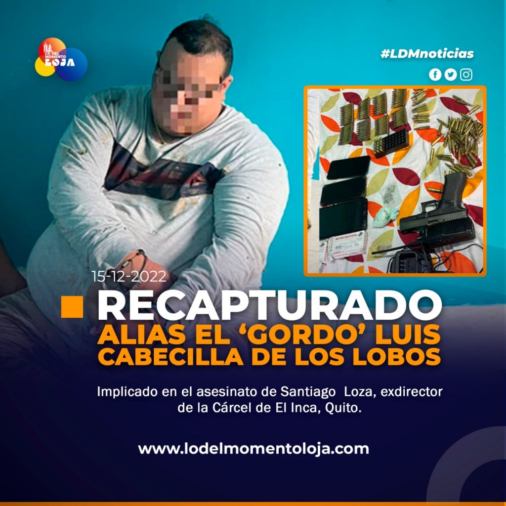 #Ecuador | El cabecilla de Los Lobos, Luis Alfredo A., alias “Gordo Luis”, fue recapturado en un operativo ejecutado la noche de ayer en Quevedo, provincia de Los Ríos. El mismo, que está implicado en el asesinato de Santiago Loza, exdirector de la Cárcel de El Inca, de Quito.