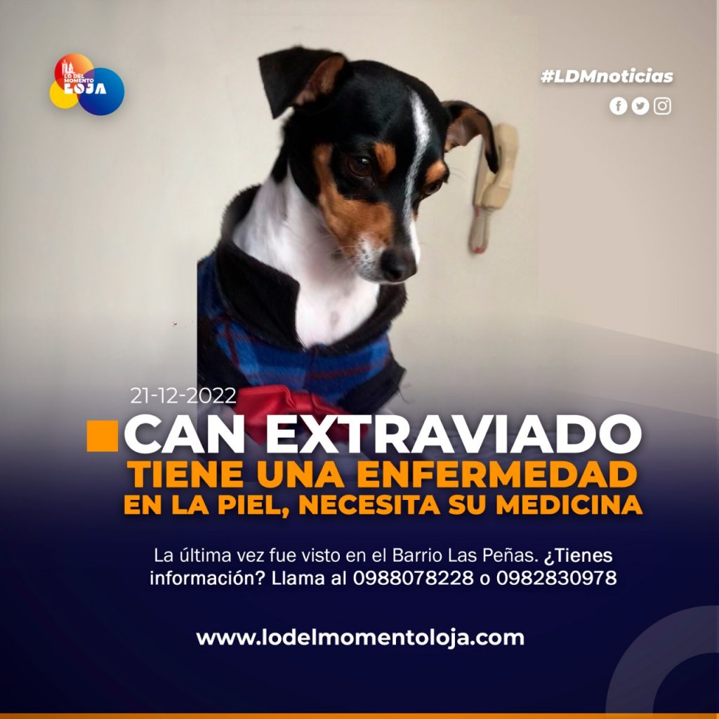 Lucas un perrito de raza Pinscher de color blanco con manchas negras y marrones, desapareció la tarde del 20 de Diciembre, del barrio ‘Las Peñas’, el can tiene una enfermedad en la piel y hay que ponerle medicamento todos los días.