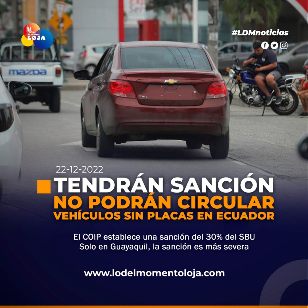 El Código Orgánico Integral Penal (COIP) establece una sanción del 30% del Salario Básico Unificado (USD 425) para quien conduzca un vehículo sin placa.