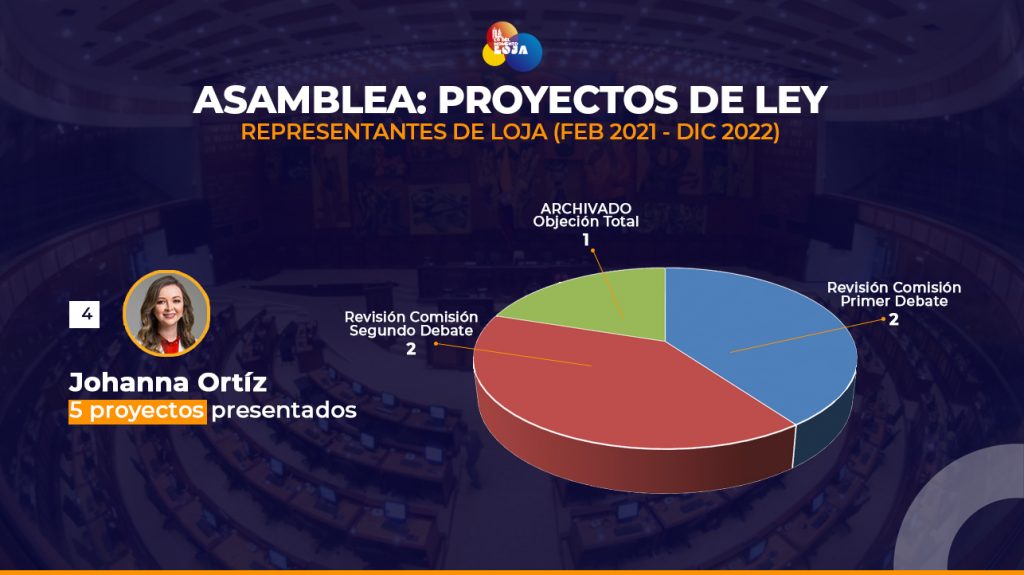 Finalmente, Johanna Ortiz Villavicencio, asambleísta de la alianza Unión por la Esperanza (UNES), ha presentado un total de cinco proyectos, de los cuales dos proyectos se encuentran en Revisión en Comisión para Primer Debate, otros dos proyectos se encuentran se Revisión en Comisión para Segundo Debate, y finalmente un Proyecto de Ley está archivado debido al Registro de Objeción Total.
