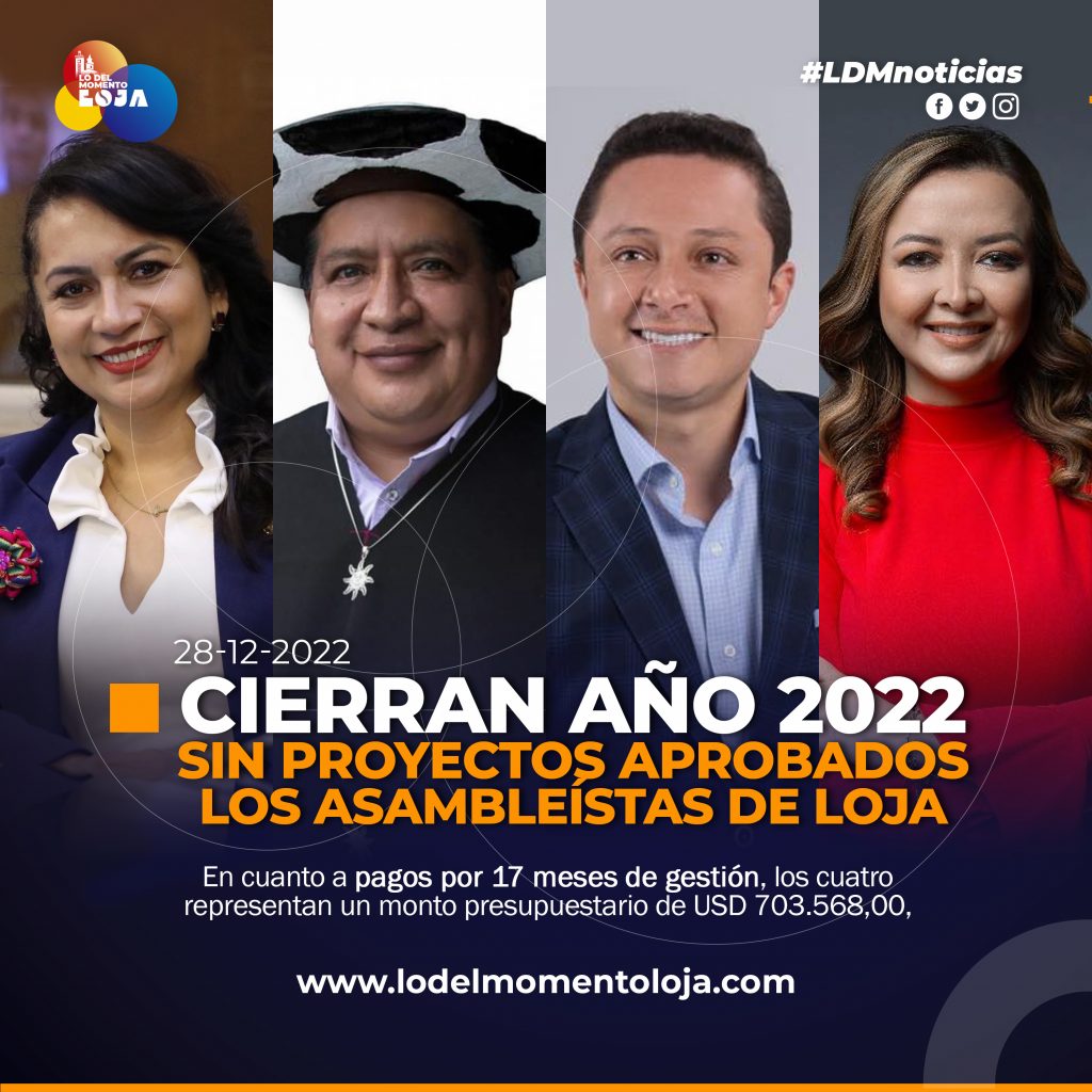 Luego de todo este periodo de actividades que han mantenido como asambleístas, ninguno de los representantes por parte de la provincia de Loja tienen aprobados proyectos o reformas de Ley, generando a más de uno la interrogante: ¿Qué han hecho durante su periodo en el cargo como asambleístas? Esto, considerando el sueldo que reciben y las necesidades que tiene el país, algo que no está muy acorde a una realidad palpable ante la opinión pública.