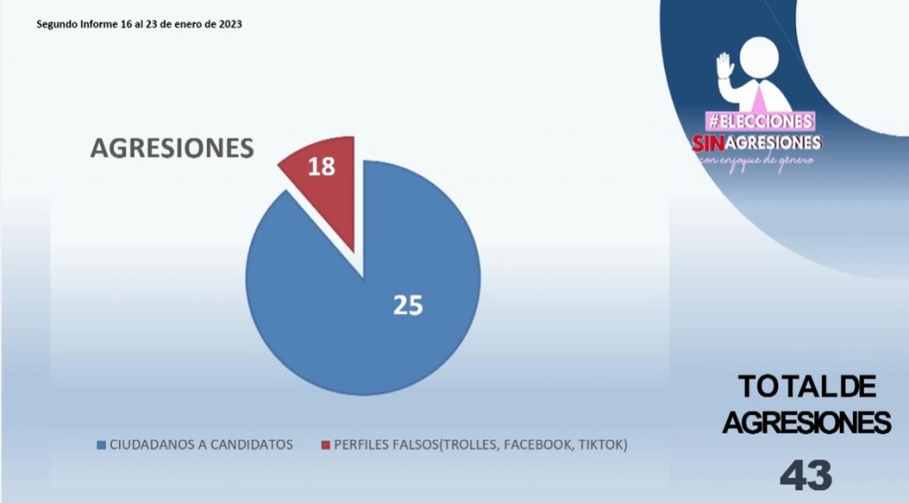 Entre los últimos días que se menciona en el análisis, se han podido recopilar 43 agresiones, emitidas desde ciudadanos a los candidatos, también como de perfiles falsos en redes como facebook y tik tok.