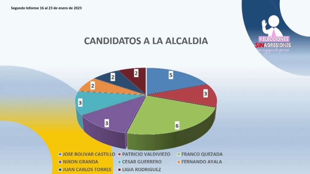 Desde la Fundación CAJE se realizó una campaña denominada “Elecciones sin agresiones, con enfoque de género”, en una primera etapa se ha realizado el monitoreo que tiene intervalo establecido del 16 al 22 de enero 2023, aquí, se ha realizado un registro mediante una ficha técnica valorada: la cual cuenta con la información requirente para la valoración del tipo de agresión que se registra hacia los diferentes candidatos. La ficha consta de nombres de los agresores, perfiles de redes sociales, link y fechas para su constatación y comprobación del tipo de ataque.