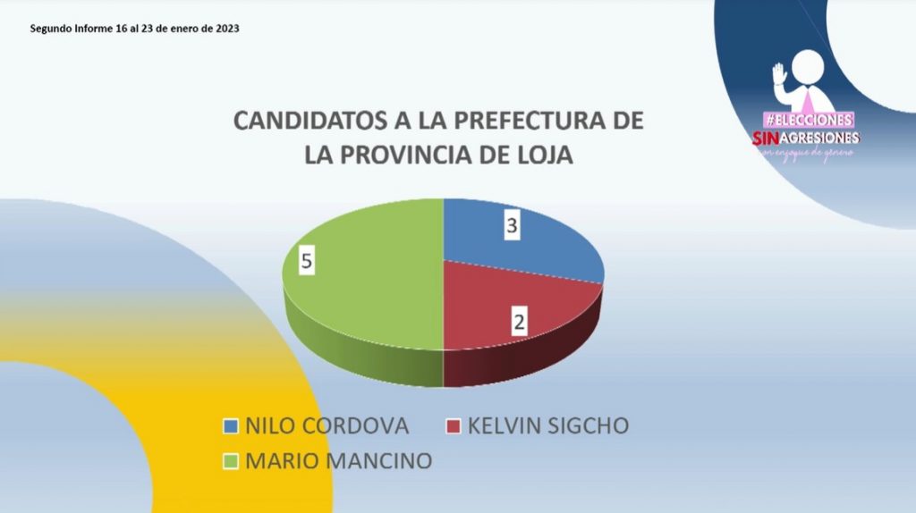 Los candidatos a la Prefectura de Loja tampoco están exentos de estas agresiones monitoreadas por la iniciativa que impulsa Fundación CAJE, en cuanto a los postulantes provinciales, el candidato de la alianza SUMA-APLA, Mario Mancino es el que más agresiones ha recibido, generando un total de 5 en los últimos días, seguido de Nilo Córdova con un total de 3 agresiones y finalmente, Kelvin Sigcho con 2 agresiones en el tiempo antes mencionado.