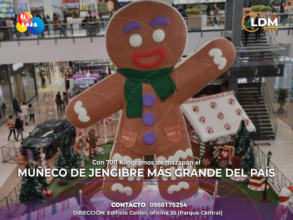 Aproximadamente un mes de trabajo diario y minucioso le tomó a la Unión Artesanal de Productores Progresistas de Mazapán de Calderón, ubicada en el norte de Quito, la elaboración de un muñeco de jengibre gigante, de cerca de ocho metros de alto, con motivo navideño.