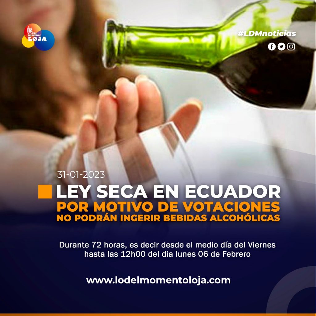 El horario de la ley seca rige desde las 12h00 horas del día viernes 03 de febrero hasta las 12h00 del día lunes 06 de febrero, las personas que infrinjan la ley serán sancionadas de acuerdo a la ley.