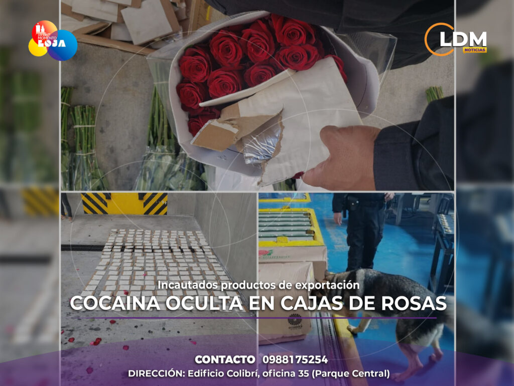En el área de carga del Aeropuerto Internacional de Quito Mariscal Sucre, la Policía encontró 7.2kg de cocaína (72.848 dosis) ocultos en cajas de cartón con rosas de exportación.