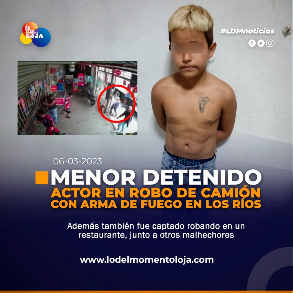 😱🔫🧒🏻 ¡No llega ni a 15 años! Un menor de edad, actor principal en un robo a un camión y transeúntes con arma de fuego, fue detenido en Los Ríos por uniformados, además el infante también fue registrado en cámaras, en un robo a un restaurante del sector.