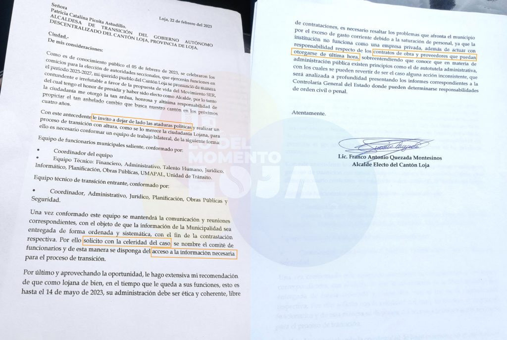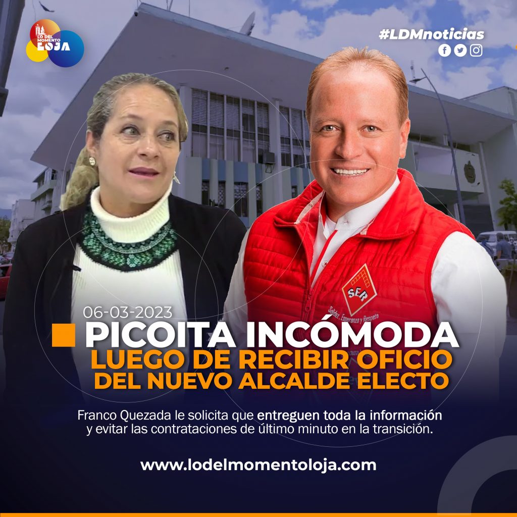 Patricia Picoita quien asume la Alcaldía de Loja tras la muerte del exalcalde Bailón está por culminar su periodo frente al Municipio por lo que corresponde el periodo de transición de la administración con alcalde electo Franco Quezada, tras haber ganado la contienda electoral en las elecciones seccionales 2023, sin embargo, este proceso ha traído mal sabor de boca a Picoita tras haber recibido un oficio del alcalde electo en donde le hacía mención de varias cosas para llevar un cambio de administración de forma ordenada, algo que no le cayó bien a la autoridad saliente.