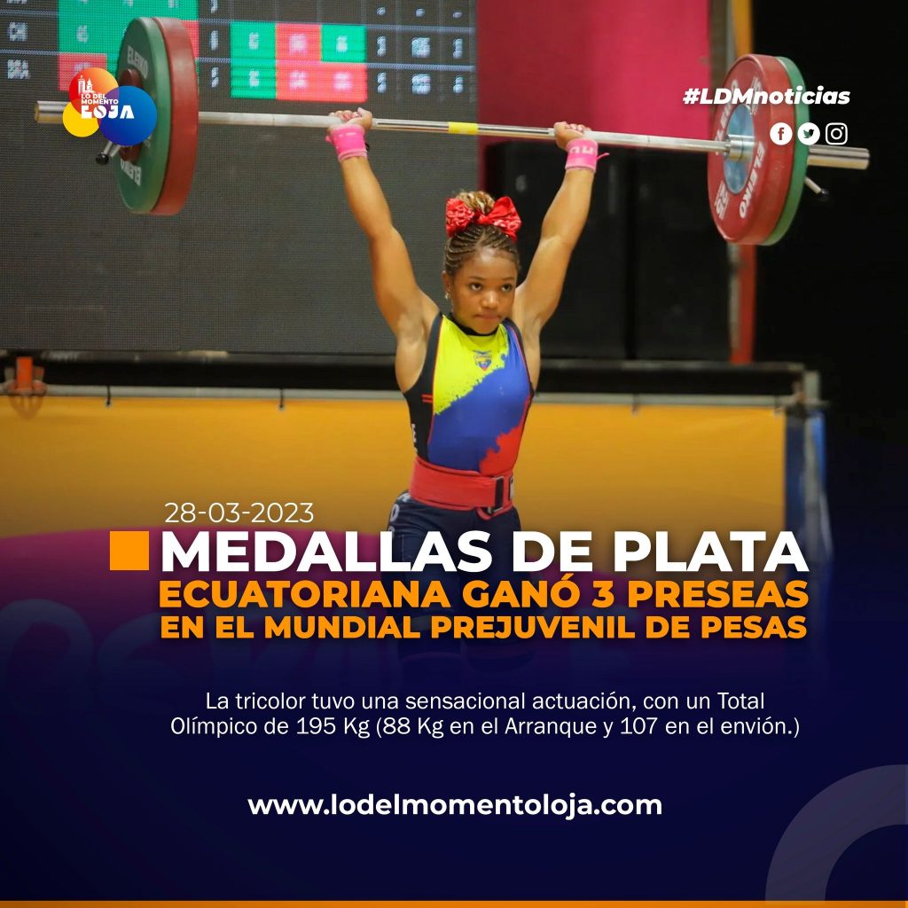 🤩🏋🏻♀️🥈 ¡Medalla triple para Ecuador! La pesista ecuatoriana Jéssica Palacios, de 17 años, ganó tres medallas de plata en el Mundial Prejuvenil de Levantamiento de Pesas de Albania, el 28 de marzo del 2023. Con un Total Olímpico de 195 Kg, logrando 88 Kg en el Arranque y 107 en el envión.
