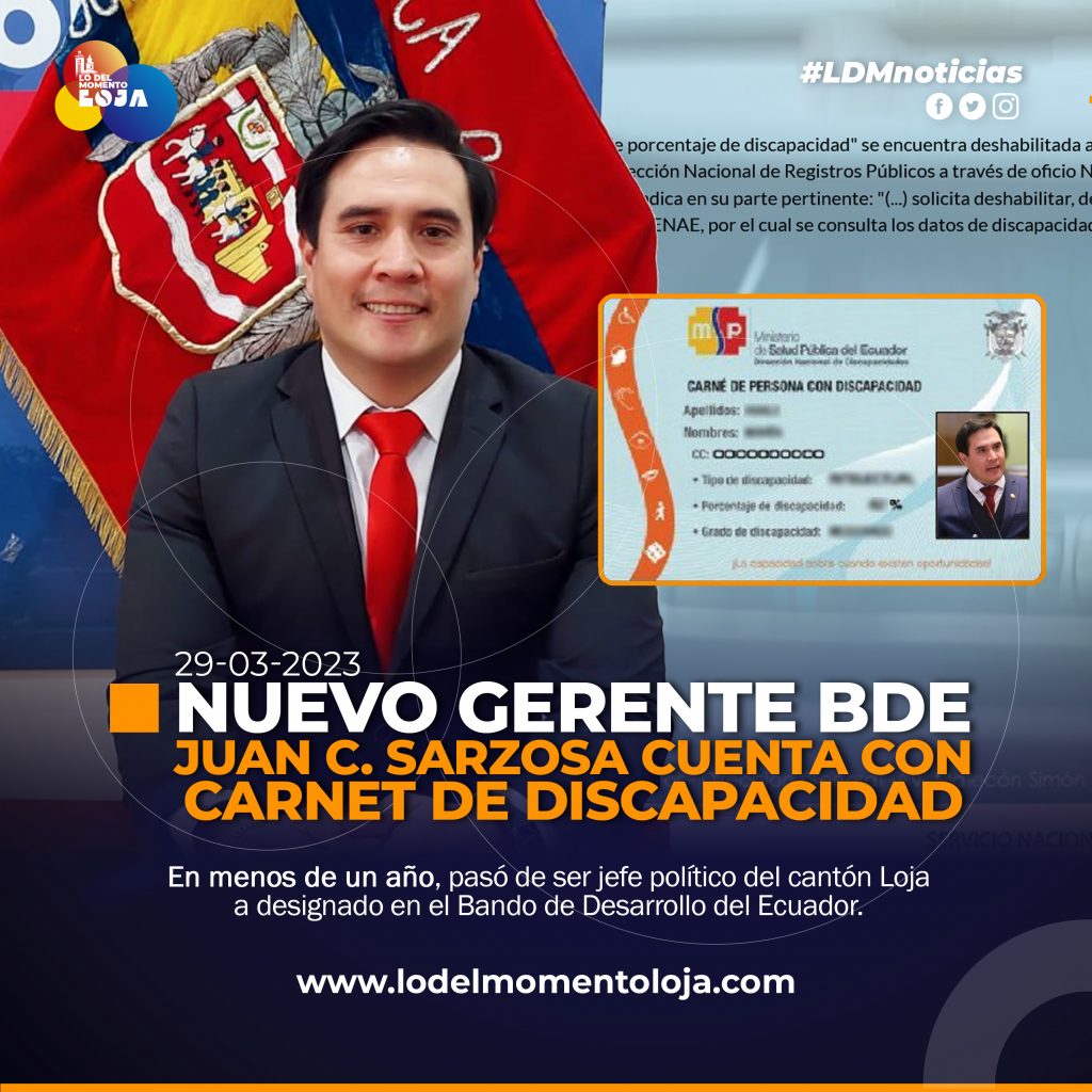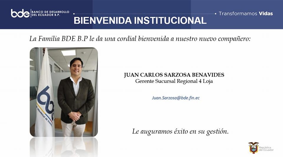Desde el lunes 27 de marzo 2023, mediante memorando BDE-2023-0156-M, Juan Carlos Sarzosa Benavides asumió la Gerencia de la sucursal zonal sur del Banco de Desarrollo del Ecuador (BDE) en Loja, reemplazando a Jorge Zárate Castro. La nueva autoridad, se venía desempeñando como Jefe Político del cantón Loja a mediados del mes de septiembre del 2022, acompañando a Fredy Bravo como Gobernador de Loja.