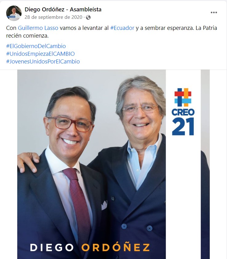 En un post del 28 de septiembre del 2020, Diego Ordoñez posaba con Guillermo Lasso bajo un diseño publicitario del Movimiento CREO 21, hacía alusión que levantarían el país, una publicación que era con un año de anticipación a las elecciones presidenciales del 2021.
