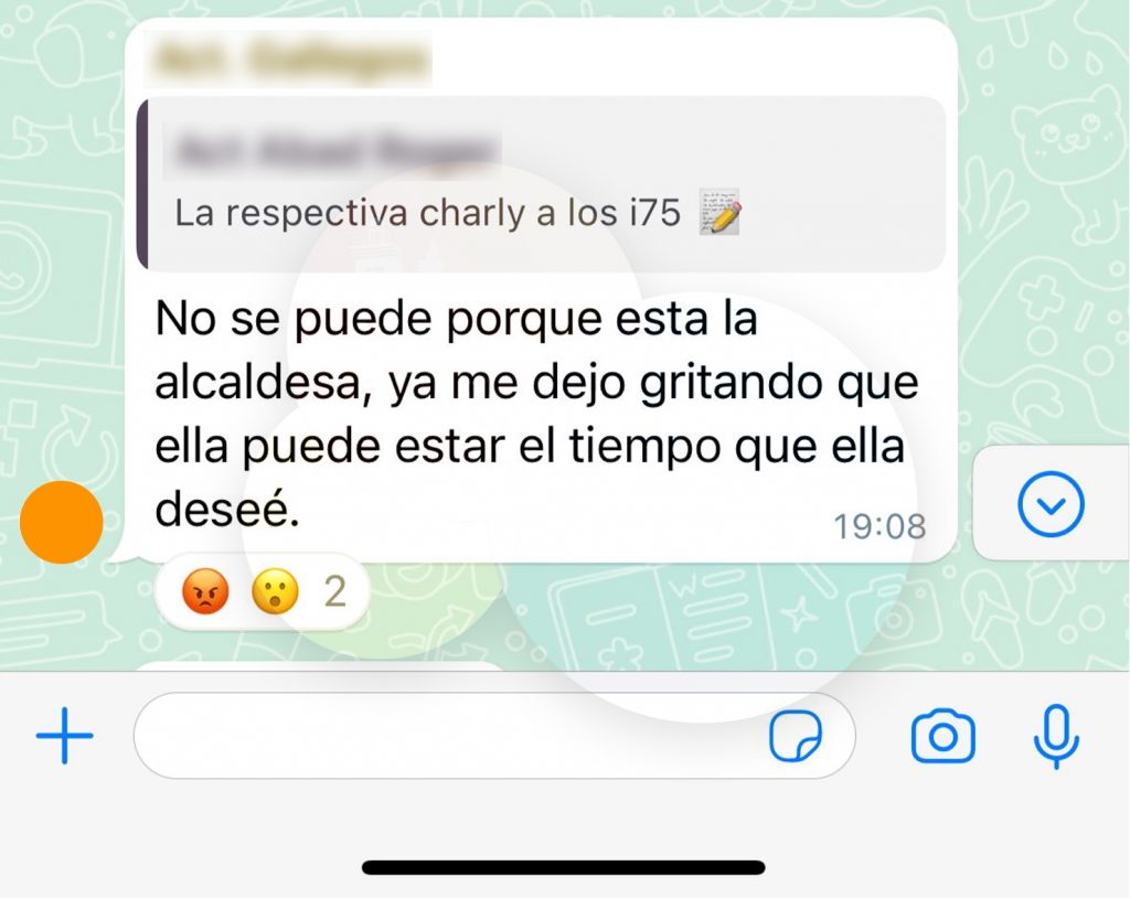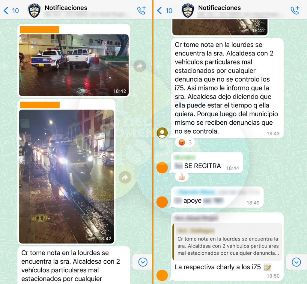 Así mismo, mediante un chat de notificaciones de los Agentes de UCOT, adjuntan otro vehículo más y exponen que Patricia Picoita se encuentra con dos autos particulares irrespetando el orden, sin embargo, al realizar su trabajo una agente de tránsito, expresa que la alcaldesa le gritó diciéndole que puede estar el tiempo que ella quiera y recalca que luego desde el mismo municipio se reciben denuncias que no se controlan esas situaciones.