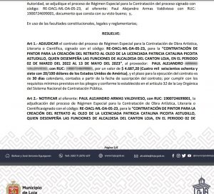 A través de memorando No. ML-A-2023-0402-M, del 11 de abril de 2023, adjunto a este expediente de contratación, la Lcda. Patricia Picoita Astudillo, Alcaldesa del cantón de Loja, designa a Gabriela Masache Merchan, como DELEGADA DE LA MÁXIMA AUTORIDAD, para el procedimiento de “CONTRATACIÓN DE PINTOR PARA LA CREACIÓN DEL RETRATO AL OLEO DE LA LICENCIADA PATRICIA CATALINA PICOITA ASTUDILLO, QUIEN DESEMPEÑA LAS FUNCIONES DE ALCALDESA DEL CANTÓN LOJA, EN EL PERIODO 02 DE MARZO DEL 2022 AL 13 DE MAYO DEL 2023”, siendo responsable de actuar en la fase precontractual responsabilizándose de revisión del expediente, responder todas las preguntas y elaborará las respuestas y aclaraciones necesarias, apertura, revisión de oferta y convalidación de errores, evaluación y calificación de la oferta y, la recomendación expresa de adjudicar o no al proveedor.