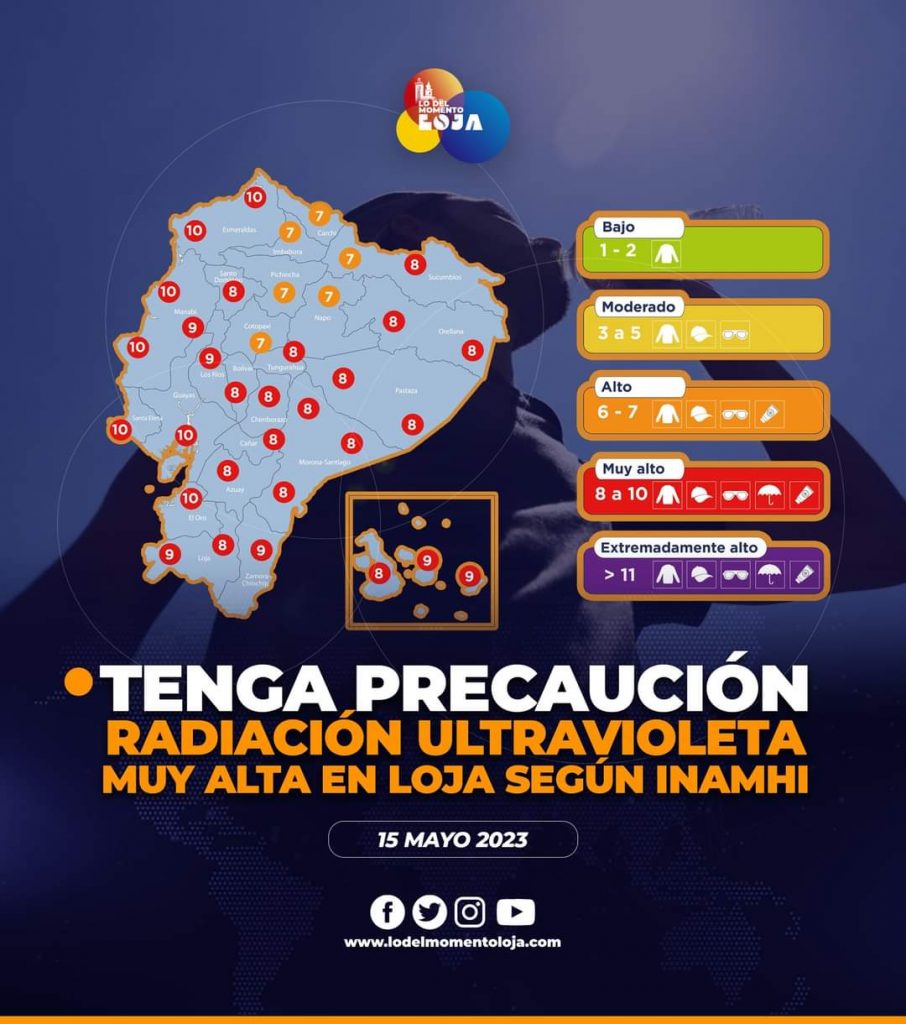 😎🌞🌡️¡Cuidado con los rayos UV! En Loja, el índice de radiación ultravioleta es muy alta, por lo que se recomienda portar gorras, gafas, protector solar, buzos de manga larga, evitar vestimenta color negro, permanecer en sombra, entre otros.