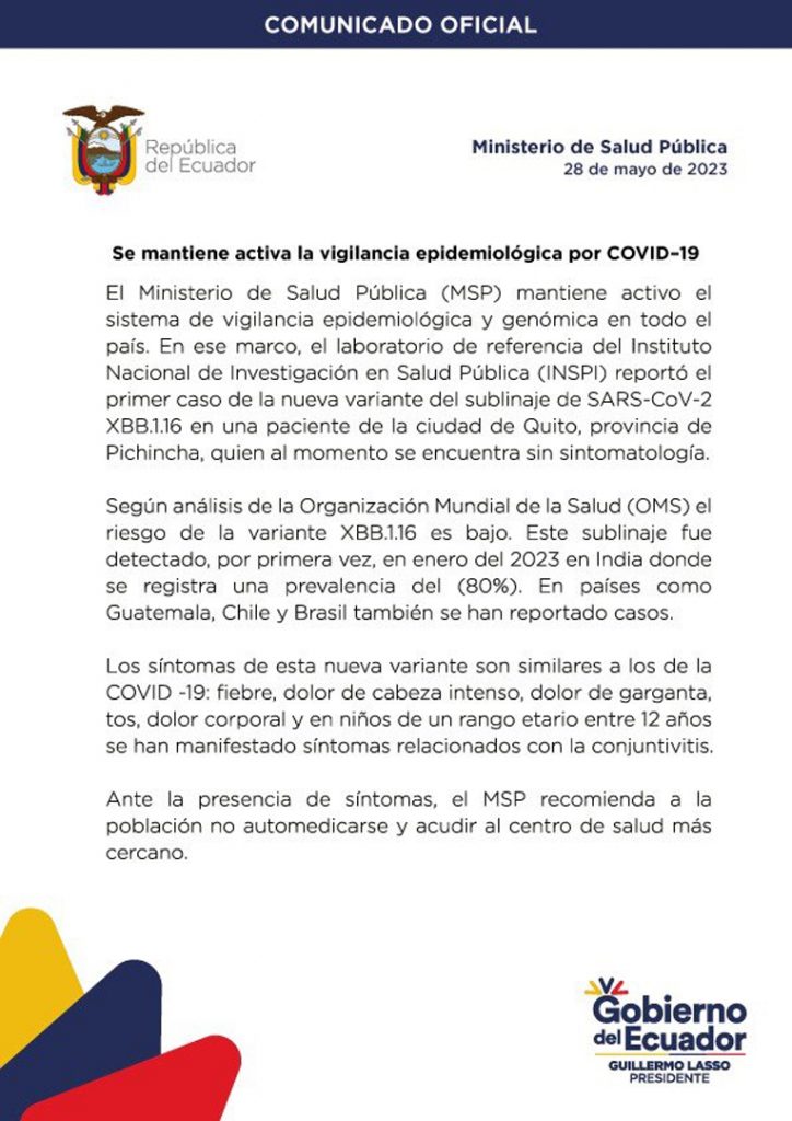 Mediante un comunicado oficial del Ministerio de Salud Pública del Ecuador en la mañana del domingo 28 de mayo, desde el laboratorio del Instituto Nacional de Investigación en Salud Pública (INSPI) reportó el primer caso de la nueva variante del sublinaje de SARS-CoV-2 XBB.1.16 en una paciente de Quito, quien al momento se encuentra sin sintomatología.