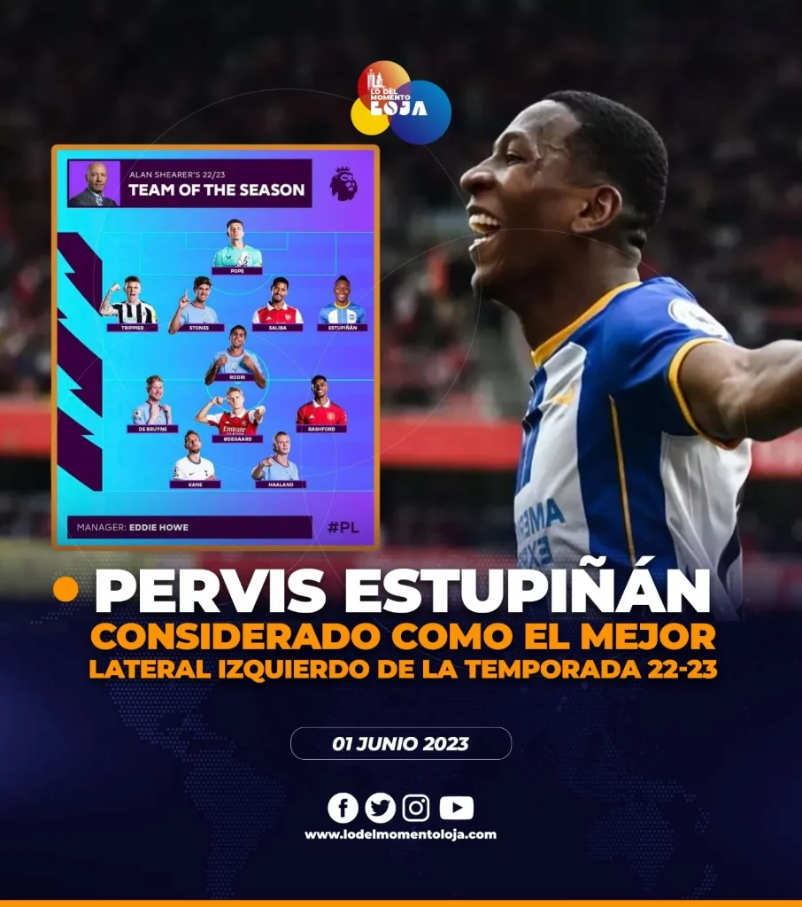 👏🏼🇪🇨⚽ ¡En el once ideal! La primera temporada de Pervis Estupiñán en la Premier League fue fantástica para Alan Shearer. El histórico goleador inglés puso al lateral izquierdo ecuatoriano en su equipo ideal del curso 2022-2023 de la Premier.