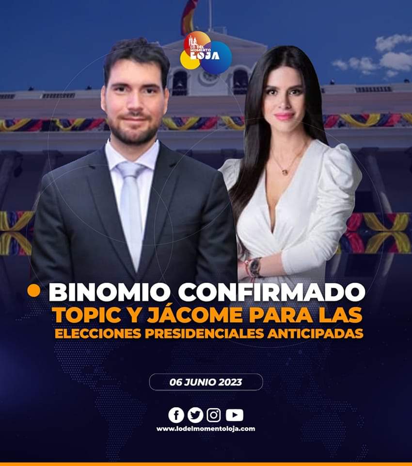 🫡✅📝 ¡Dupla confirmada! La abogada y periodista quiteña Diana Jácome será la compañera de binomio del empresario y experto en seguridad Jan Topic Feraud, según informó él mismo este 6 de junio en sus redes sociales, con el respaldo del Partido Social Cristiano (PSC), lista 6, y el Partido Sociedad Patriótica 21 de Enero (PSP), lista 3.