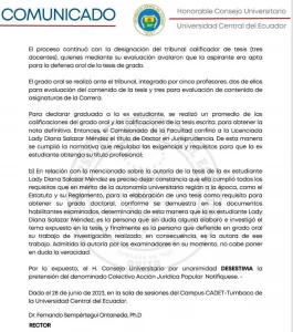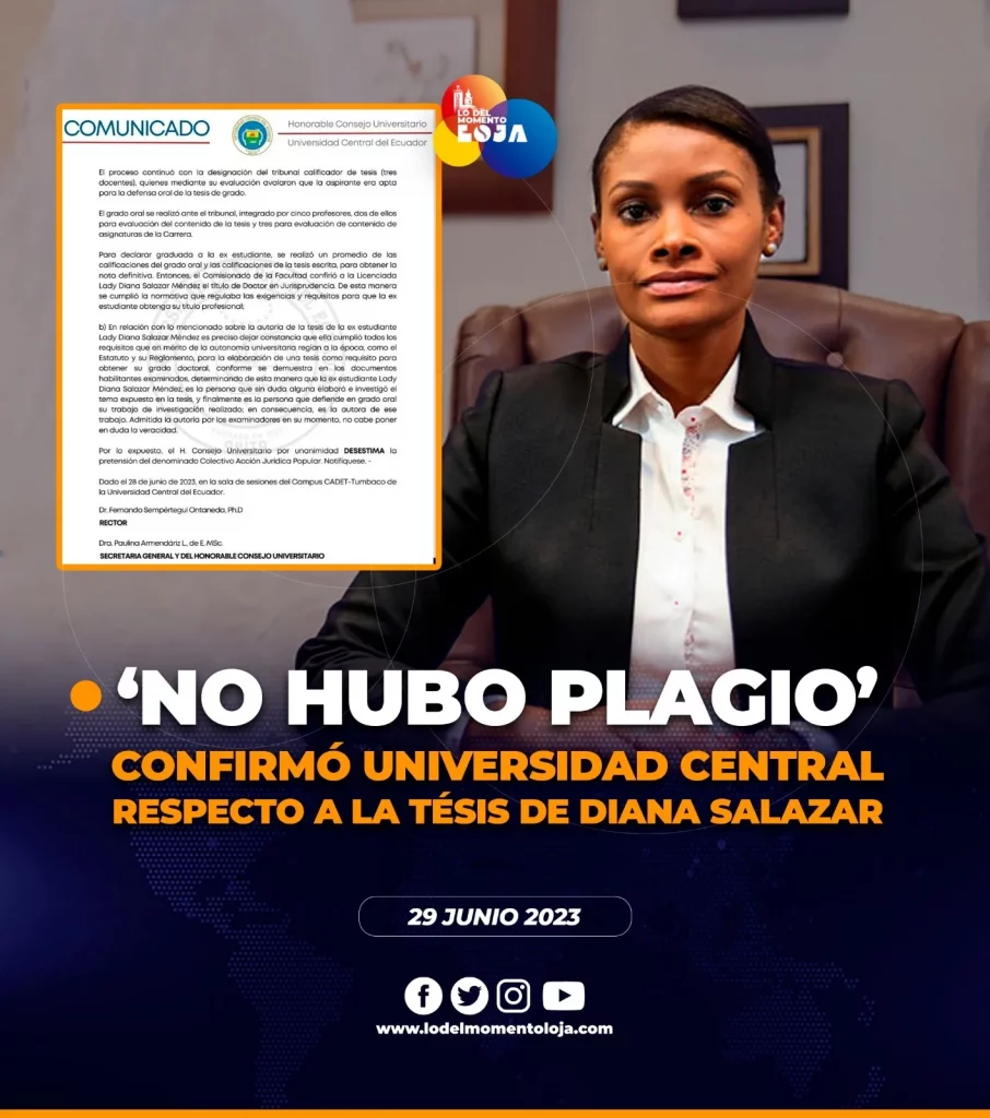 🎓👀👏🏼 ¡Todo en regla! El Consejo Universitario (HCU) de la Central desestimó el presunto plagio de la tesis de la fiscal general, Diana Salazar.