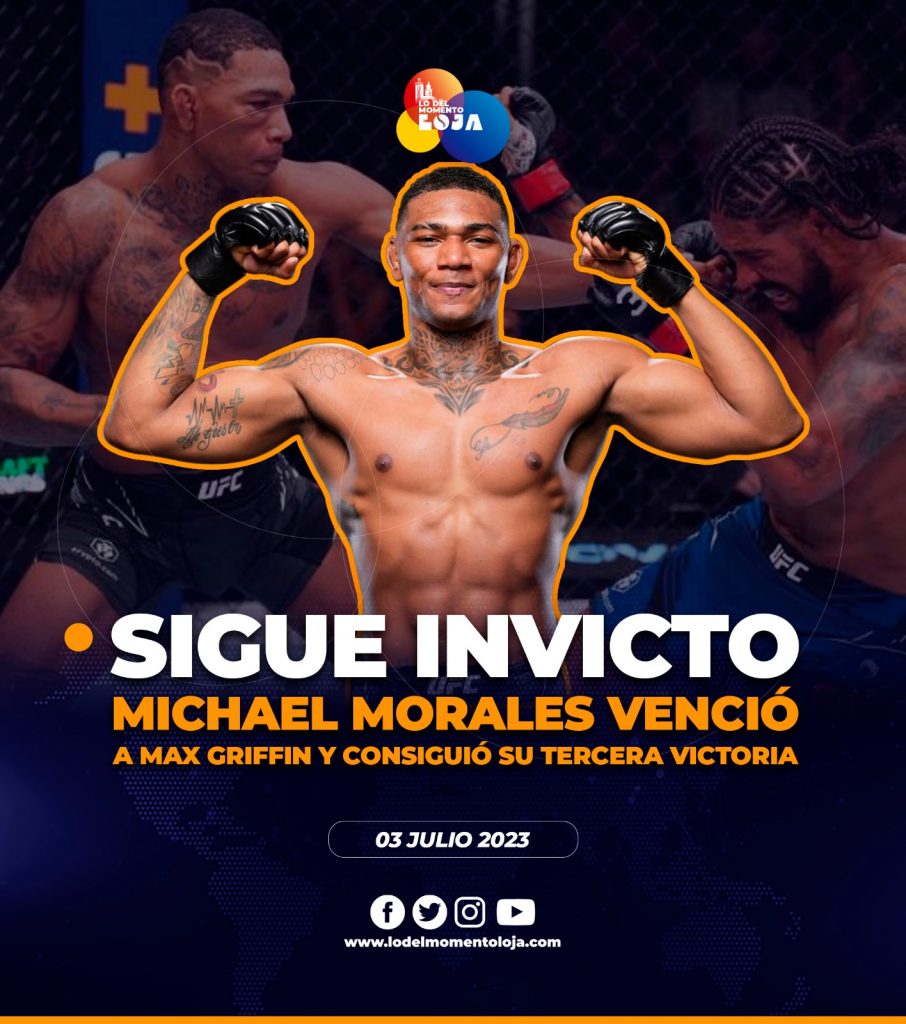 🇪🇨🥊👏🏼 ¡Victoria en UFC! El ecuatoriano Michael Morales derrotó a Max Griffin por decisión unánime, la noche de este sábado 1 de julio de 2023 en el evento UFCVegas76. Es la tercera victoria consecutiva del tricolor en UFC.