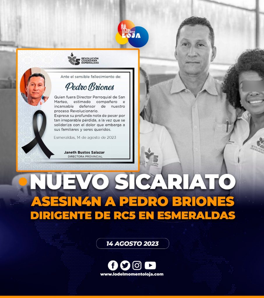 🥺🔫🕵️ ¡Otro líder político asesinado! El dirigente político de la Revolución Ciudadana, Pedro Briones, fue asesinado la tarde de este 14 de agosto, en San Mateo, provincia de Esmeraldas, tras recibir un disparo a la altura del tórax. La noticia fue confirmada por miembros del partido.
