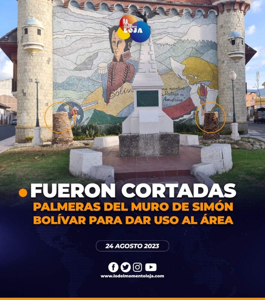 😱🪓🌴¡Hay criterios divididos! Municipio de Loja procedió a cortar las palmeras que estaban frente al mural de Simón Bolívar que está ubicado frente a la puerta de la ciudad, la finalidad de esta acción de la entidad municipal es despejar el área que en las noches instruía la luminosidad del parque y hasta para que los ciudadanos puedan ahora usar el sitio, ya que las palmeras incluso servían de urinarios. Sin embargo, por parte algunos ciudadanos, critican fuertemente la acción por cortar de esa manera las plantas, que incluso pudieron haber tenido una mejor ubicación y en este caso, un mejor final.