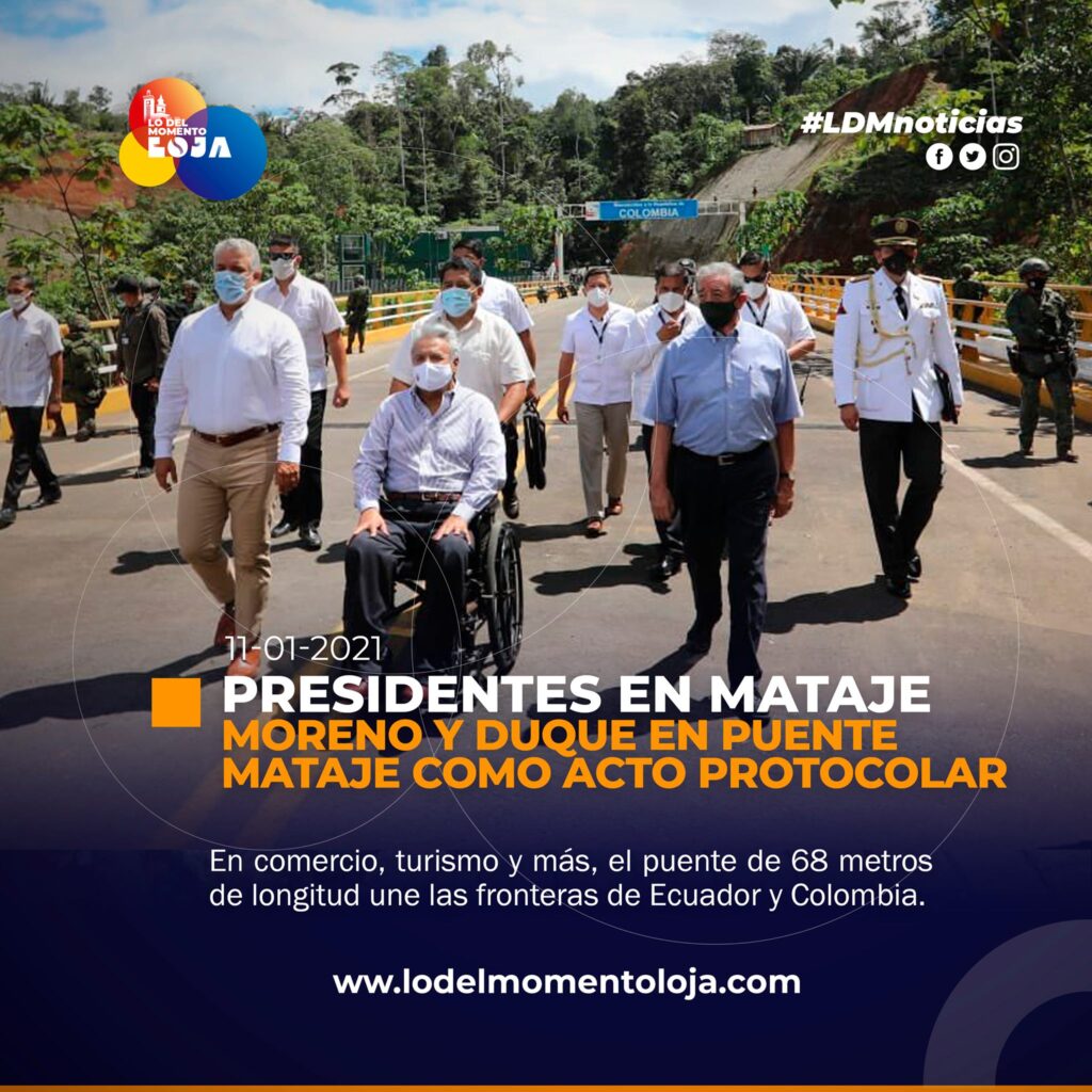 El mandatario Lenín Moreno de Ecuador y el mandatario Iván Duque de Colombia tuvieron un encuentro protocolar en el puente Mataje de provincia de Esmeraldas. En dicho encuentro, recorrieron el puente de 68 metros de longitud que une las fronteras de ambos países y según el Gobierno ecuatoriano, es “desde hace varios años una necesidad y un anhelo de ambas naciones”. Moreno, en su intervención, mencionó que el puente no es solo una “obra vial”, sino que se trata de un mecanismo de unión, comercio, turismo e intercambio cultural entre Ecuador y Colombia.