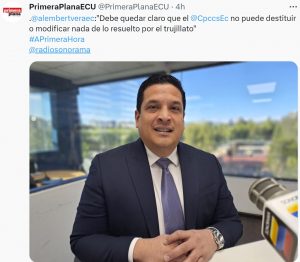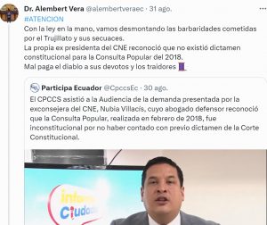 😖🗣️👀 ¡Solo no me boten! Alembert Vera presidente del Consejo de Participación Ciudadana y Control Social (CPCCS Ec) emitió comentarios contradictorios tras una posible destitución del cargo. En una aseguraba que con ley en mano iban a desmontar lo cometido por el trujillato.