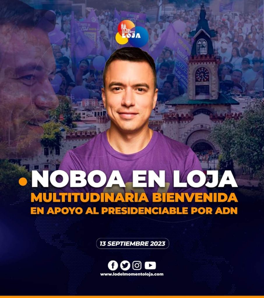 💜🎊🫂 ¡Apoyo a Noboa! Este 15 de Septiembre, la ciudad Castellana recibirá al candidato presidencial por Acción Democrática Nacional (ADN) Daniel Noboa Azín. Lo que promete ser una algarabía total de apoyo al presidenciable, tras la caravana que se realizará desde el parque Bolívar (lugar de concentración) a partir de las 14h00, hasta la plaza de San Sebastián en donde se presentarán diferentes artistas y culminará con una noche de luces.