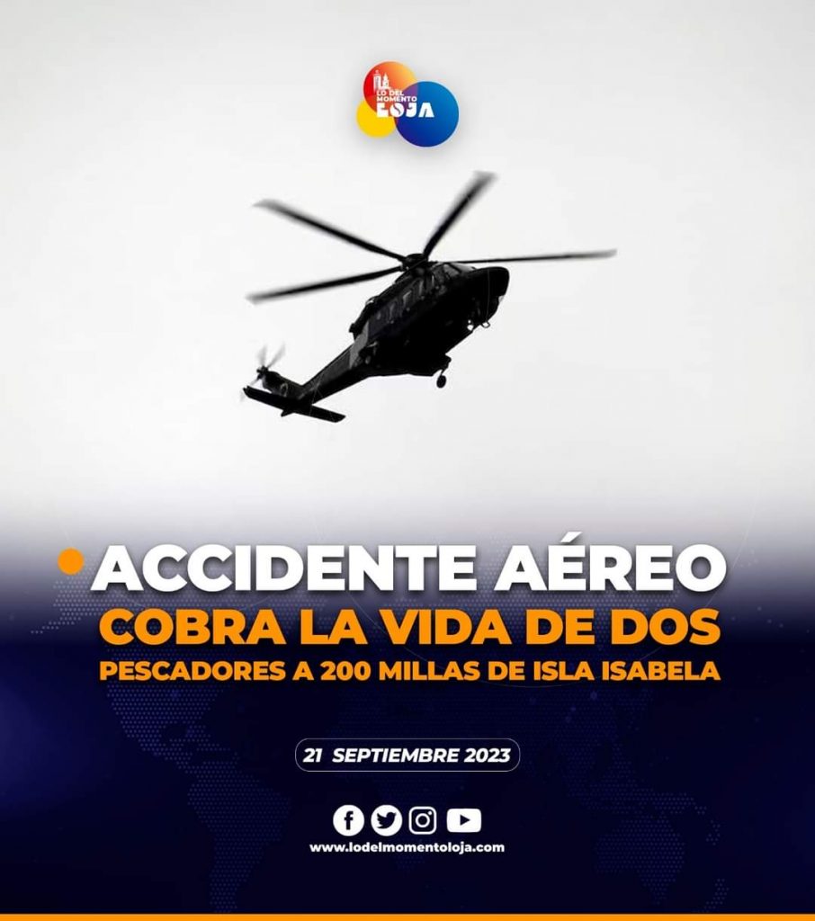 😱💥🚁 ¡Murieron tras el impacto! Dos pescadores oriundos de Manta (de 48 y 28 años de esas respectivamente) fallecieron cuando presuntamente los motores del helicóptero en que se transportaban fallaran; el accidente ocurrió a 200 millas de la Isla Isabela, en Galápagos.